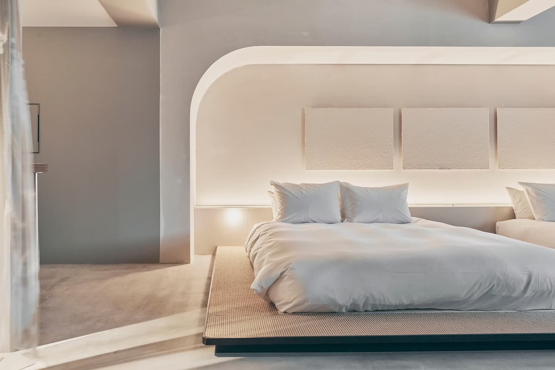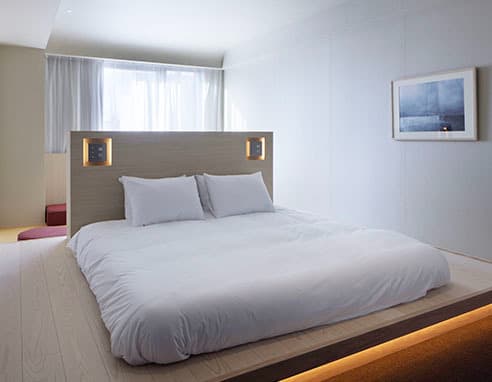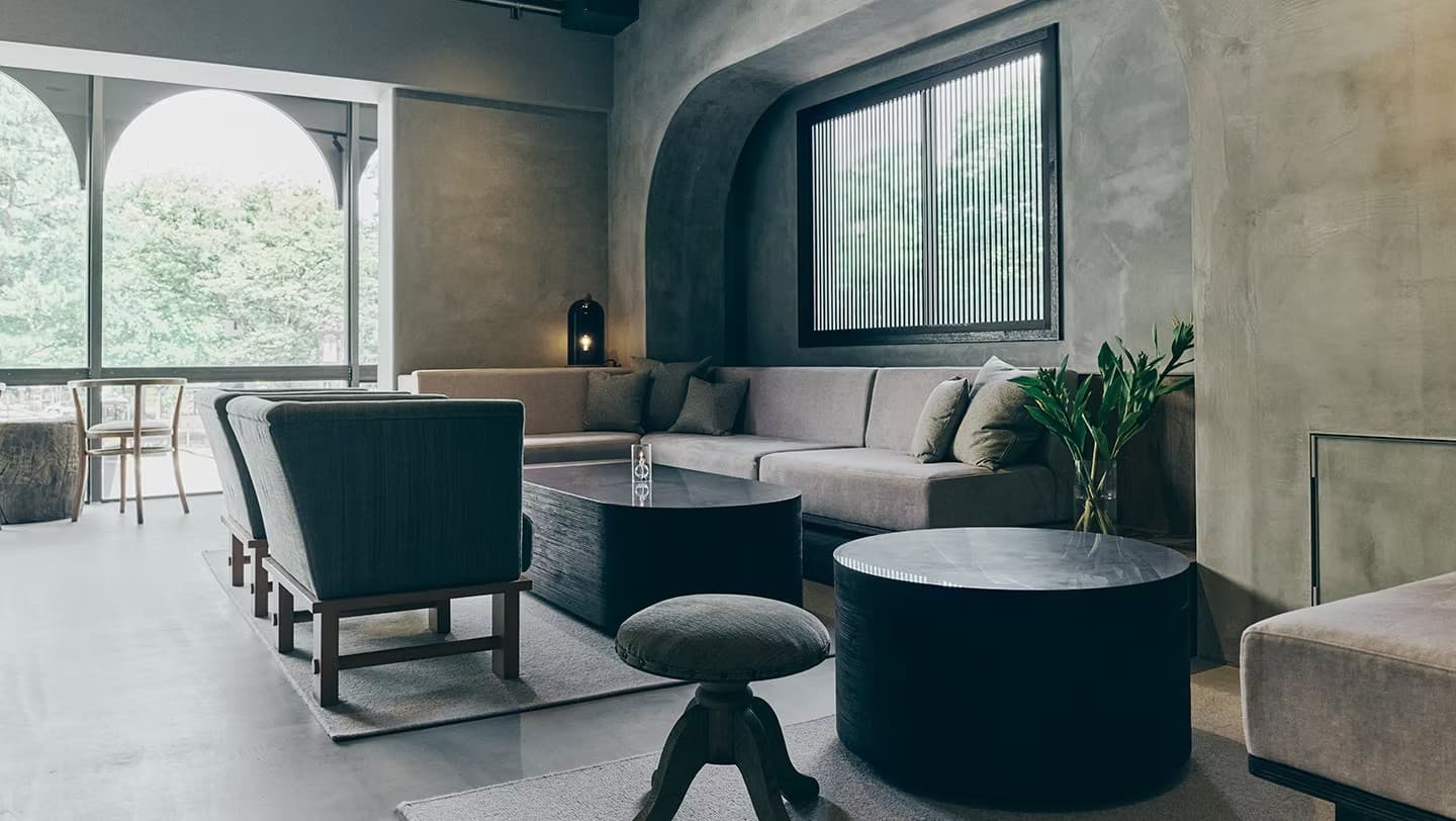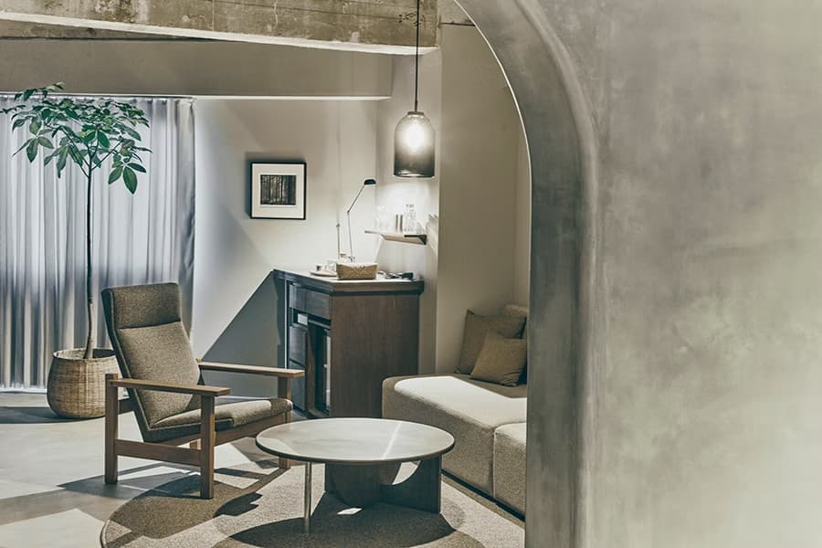 九谷焼を扱う老舗ギャラリー〈眞美堂〉のビルをリノベーションした“静かな東洋の隠れ家”、それが香林居。白山水系の澄んだ水をホテル内で蒸留し、精油や蒸留水としてアメニティに仕立て、香林居を満たしている。アーチが印象的な旧ビルの面影は、柔らかな曲線と張りつめた直線が交差する空間に再解釈され、まるで繭に包まれるようなやわらかな空間をつくっている。“香林”という理想郷に足を踏み入れたような、不確かで豊かな時間。ここでは、日常の速度がゆるやかに流れていく。