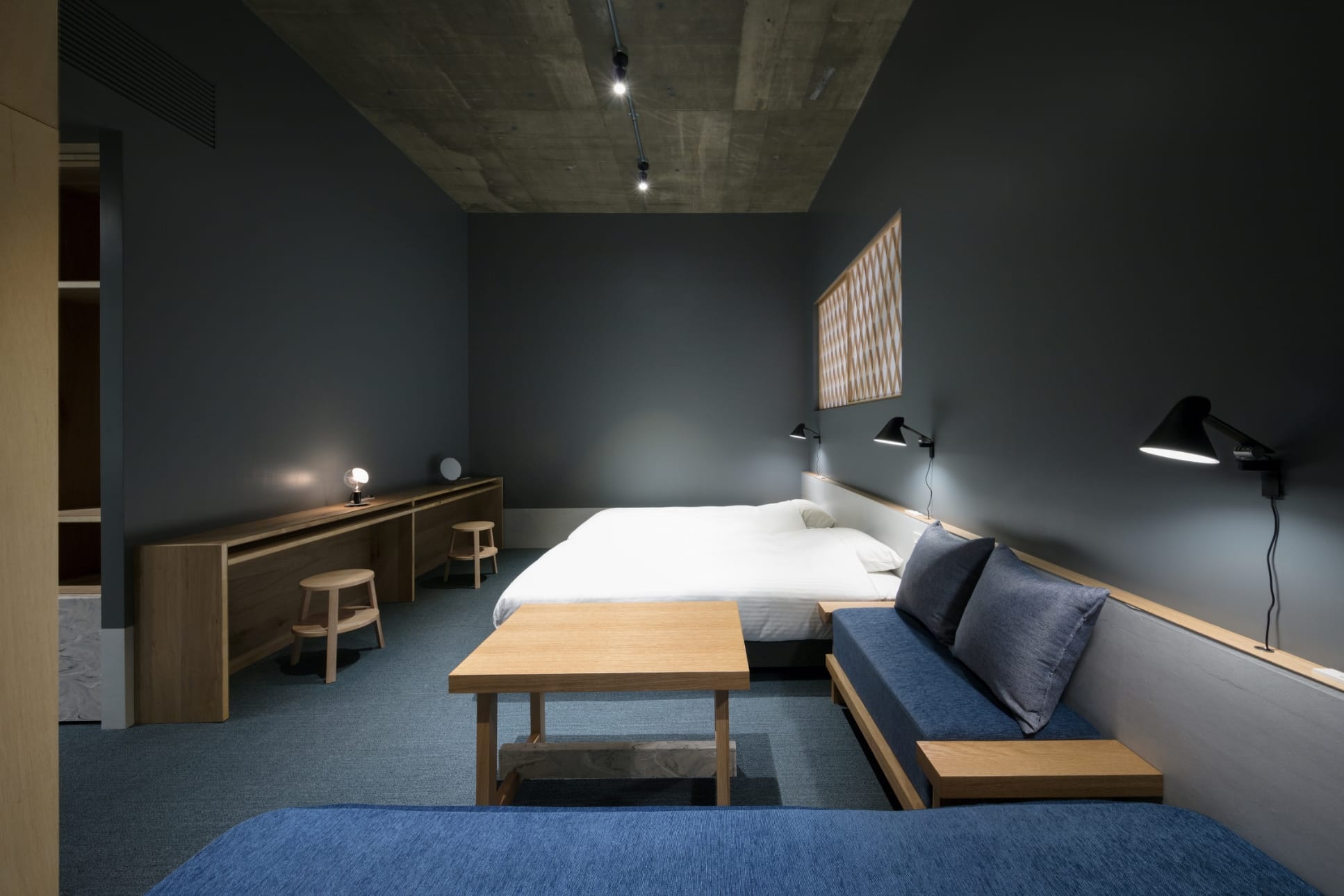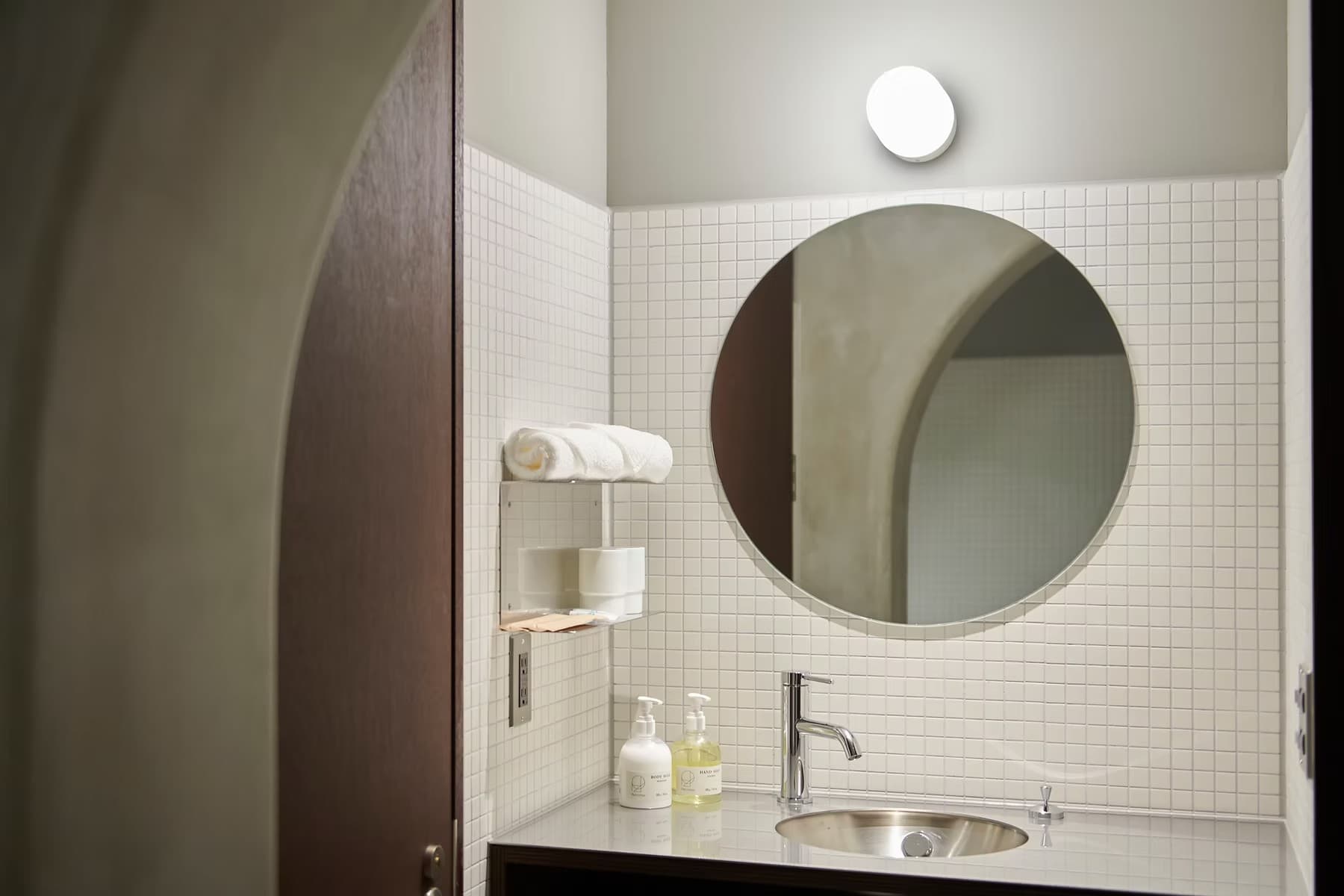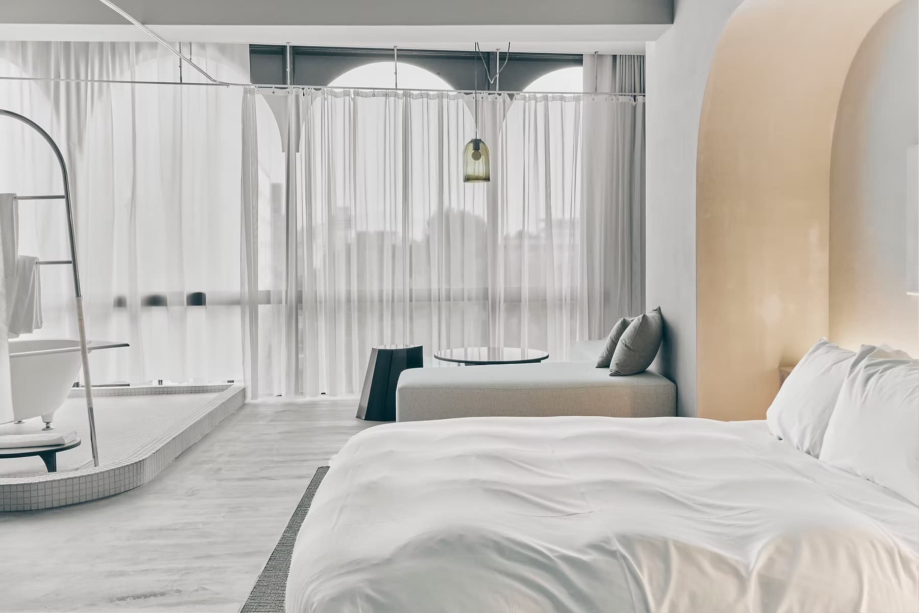 九谷焼を扱う老舗ギャラリー〈眞美堂〉のビルをリノベーションした“静かな東洋の隠れ家”、それが香林居。白山水系の澄んだ水をホテル内で蒸留し、精油や蒸留水としてアメニティに仕立て、香林居を満たしている。アーチが印象的な旧ビルの面影は、柔らかな曲線と張りつめた直線が交差する空間に再解釈され、まるで繭に包まれるようなやわらかな空間をつくっている。“香林”という理想郷に足を踏み入れたような、不確かで豊かな時間。ここでは、日常の速度がゆるやかに流れていく。